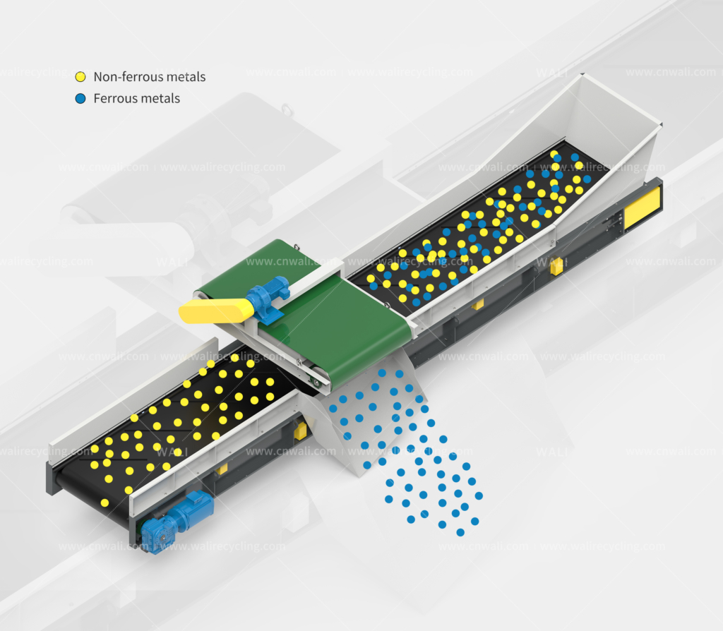 As the crushed materialspass, through, the high-intensity magnetic field generated by the separator automatically and efficiently removes ferrous metalsmixed in the materials, such as iron blocksscrews, and iron wires.