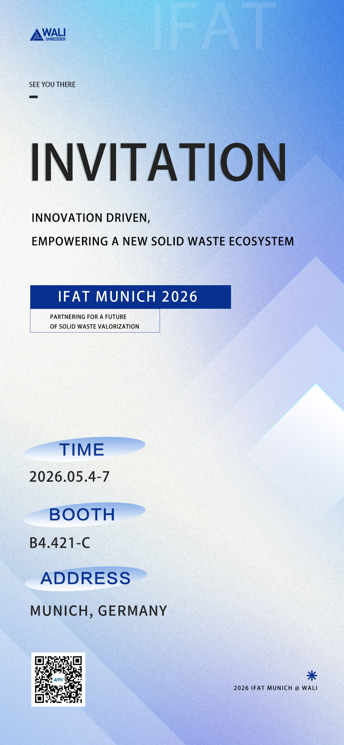 As a world-class trade fair for environmental technologies first held in 1966, IFAT is widely recognized as one of the most influential exhibitions in the global environmental sector, and serves as an important gateway for Chinese environmental enterprises to enter the international market and connect with global resources. At this grand gathering of environmental elites from around the world, Wali will make its appearance at Booth B4.421-C. We sincerely invite friends old and new from across the globe to join us in this “green rendezvous.”