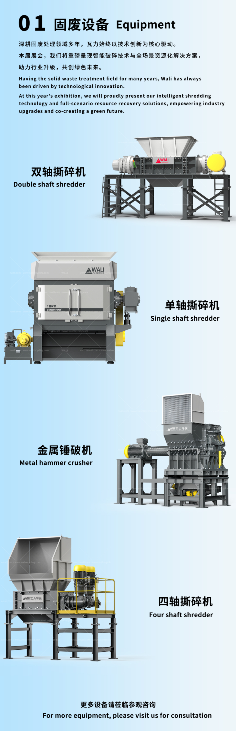 At this year’s IFAT Munich, Wali will no longer be just an “exhibitor,” but also a “listener” and “co-creator.” With an open attitude, we will engage in face-to-face conversations with global customers, gain in-depth understanding of solid waste treatment pain points in different regions, and provide customized shredding solutions tailored to different materials and needs.