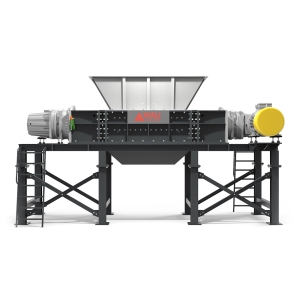 Tires are fed via conveyor belt into dual-shaft shredder for initial crushing